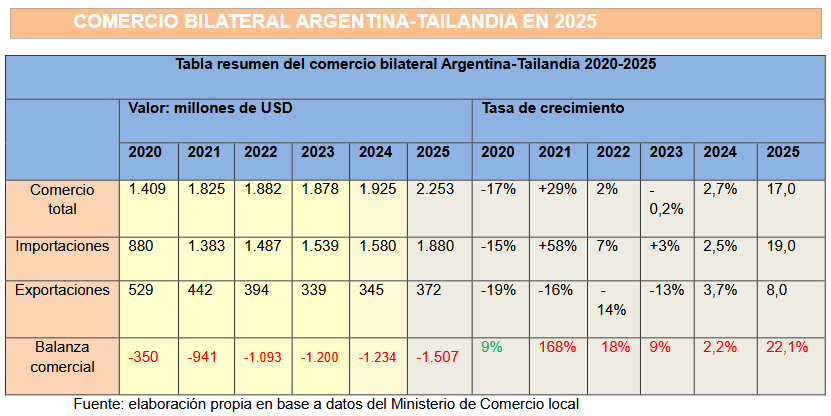 La comparación con 2024 muestra que en 2025 las exportaciones argentinas a Tailandia crecieron un 8% mientras que las importaciones desde Tailandia subieron un 19%.