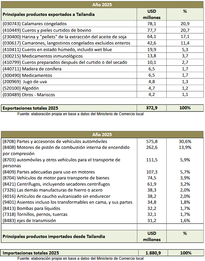 Durante 2025 las exportaciones argentinas a Tailandia se situaron en USD 372,9 millones y las importaciones desde Tailandia llegaron a USD 1.880,9 millones, lo cual generó una balanza comercial deficitaria para nuestro país de USD 1.508 millones.